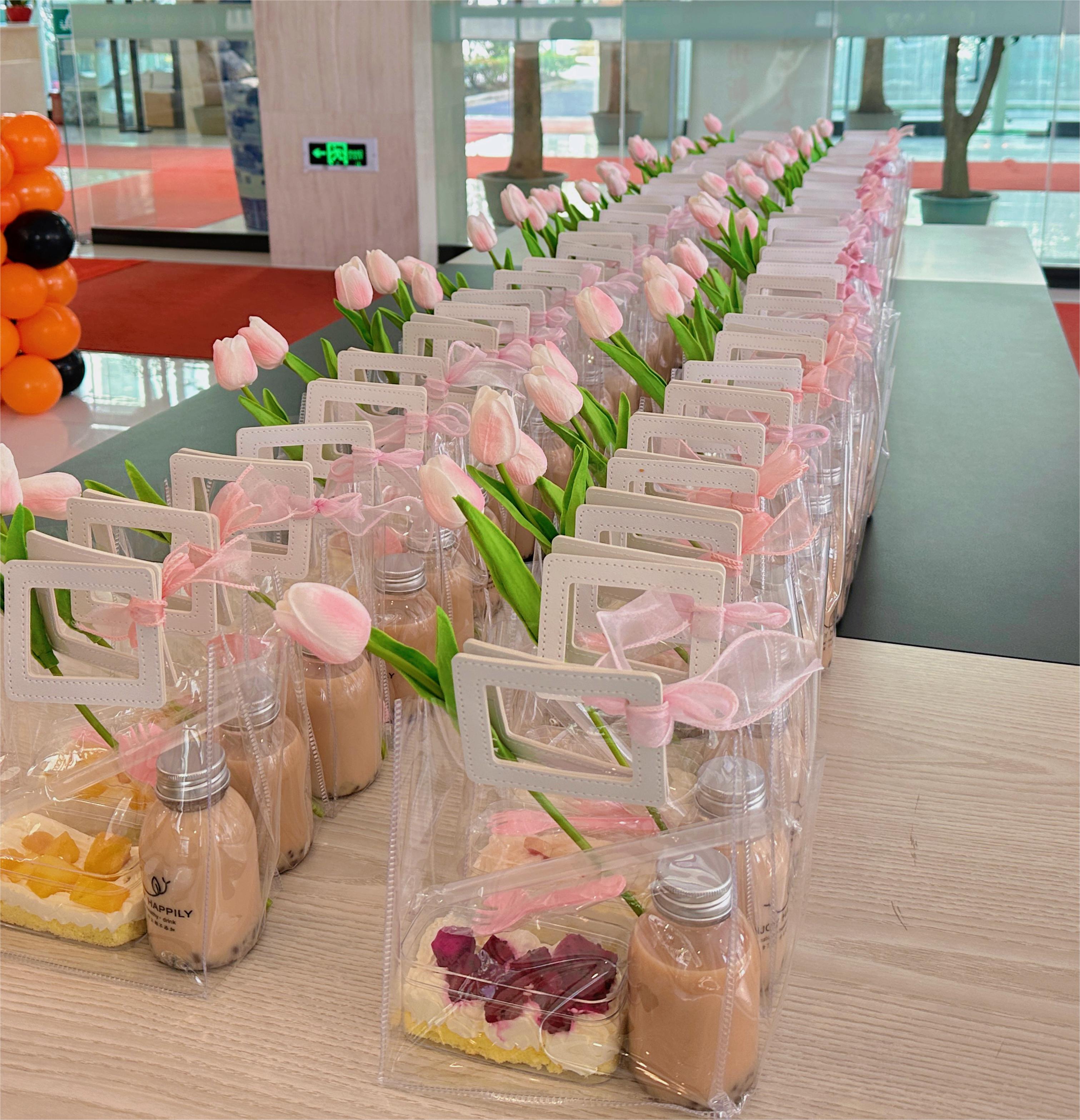 會后,韓董事長親自為每一位女性員工發(fā)放了下午茶,郁金香、甜品和奶茶。這可是公司精心為女神們挑選的噢~